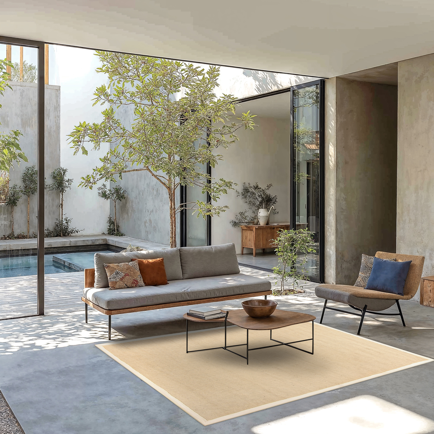 Spessore approssimativo: 6 mm. Materiale: 100 % sisal (retro in lattice e bordo opaco di cotone)..
